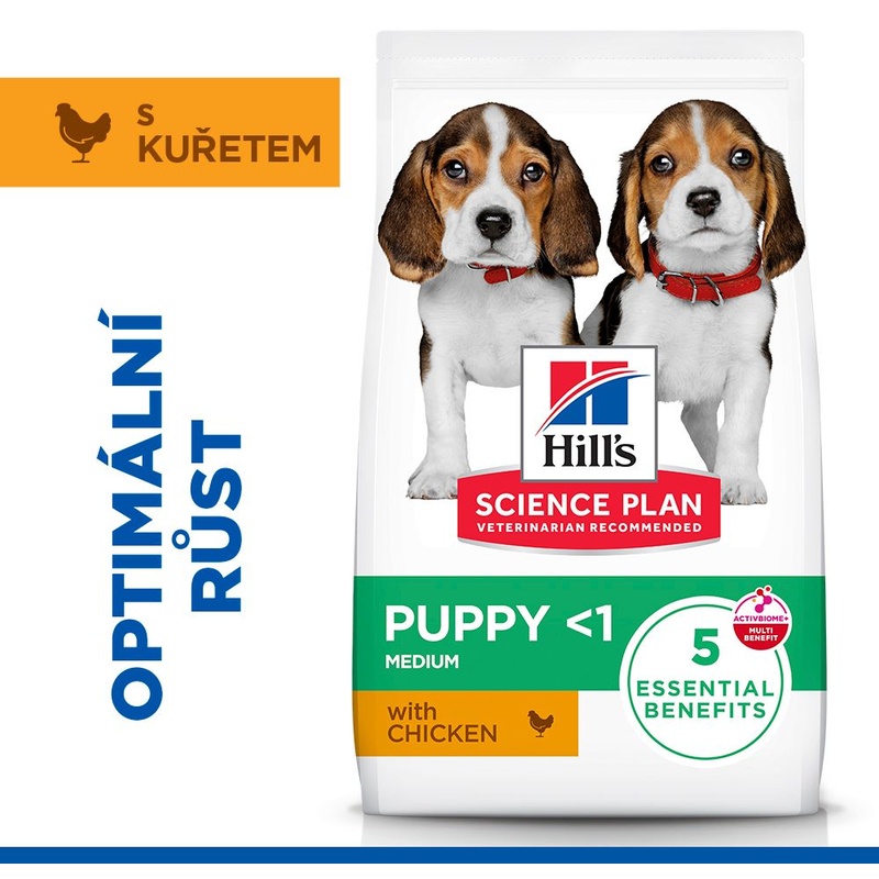 Hill's Science Plan Puppy Medium je krmivo s kuřetem pro štěňata středně velkých plemen a představuje lahodnou, zdravou a vyváženou stravu pečlivě navrženou pro vývojové potřeby psích mláďat. Granule obsahují vyváženou směs minerálních látek pro silné zuby a kosti, omega-3 mastnou kyselinu DHA z rybího oleje pro zdravý vývoj mozku a očí, vysoce kvalitní bílkoviny pro tvorbu svalové hmoty a také ingredience pro zdravé trávení. Patentovaná směs prebiotik ActivBiome+ Multi-Benefit vyživuje střevní mikrobiom, čímž podporuje funkce zažívacího traktu i celkovou pohodu vašeho mazlíčka.