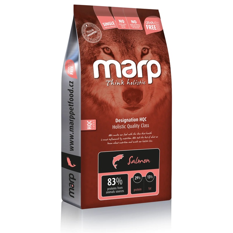 K nejdůležitějším vlastnostem krmiva Marp patří vysoká kvalita surovin od lokálních dodavatelů. Maso zpravidla pochází ze zvířat z volných chovů. Díky jednomu druhu masa (čerstvé, sušené i tuk), žádným obilninám a jednoduchému složení jde o čistě přírodní krmivo, na kterém psi dobře prospívají. Receptura Marp Holistic Salmon založená na lososu je vhodná pro psy všech plemen a věkových kategorií včetně jedinců s citlivým zažíváním a s potravními alergiemi.