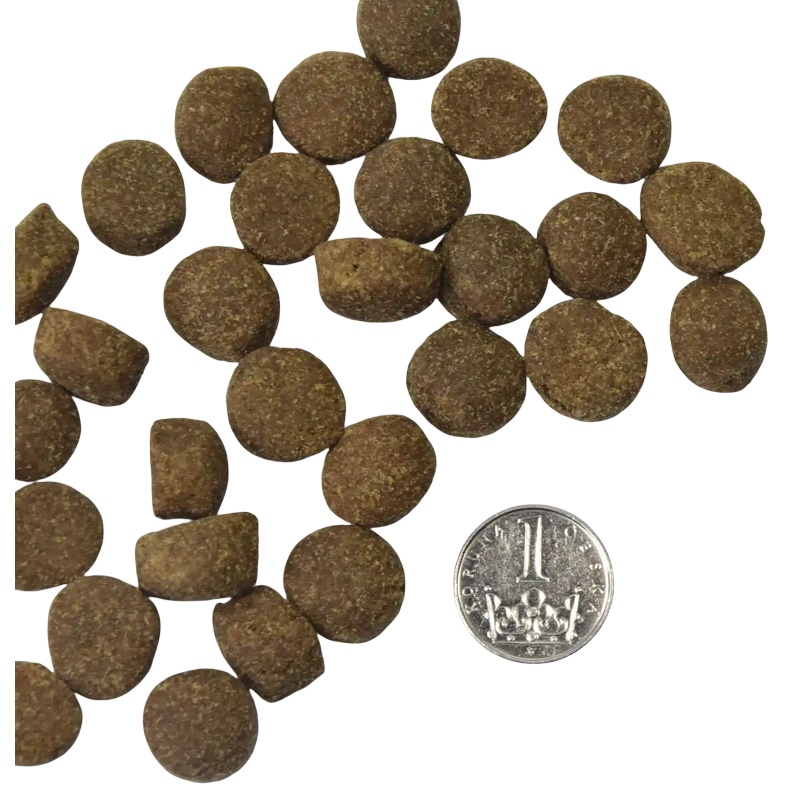 hrubý protein 23 %, hrubý tuk 13 %, hrubá vláknina 2,5 %, hrubý popel 8,5 %, vlhkost 9 %, vápník 1,5 %, fosfor 1,1 %, omega-3 mastné kyseliny 0,4 %, omega-6 mastné kyseliny 1,8 %.