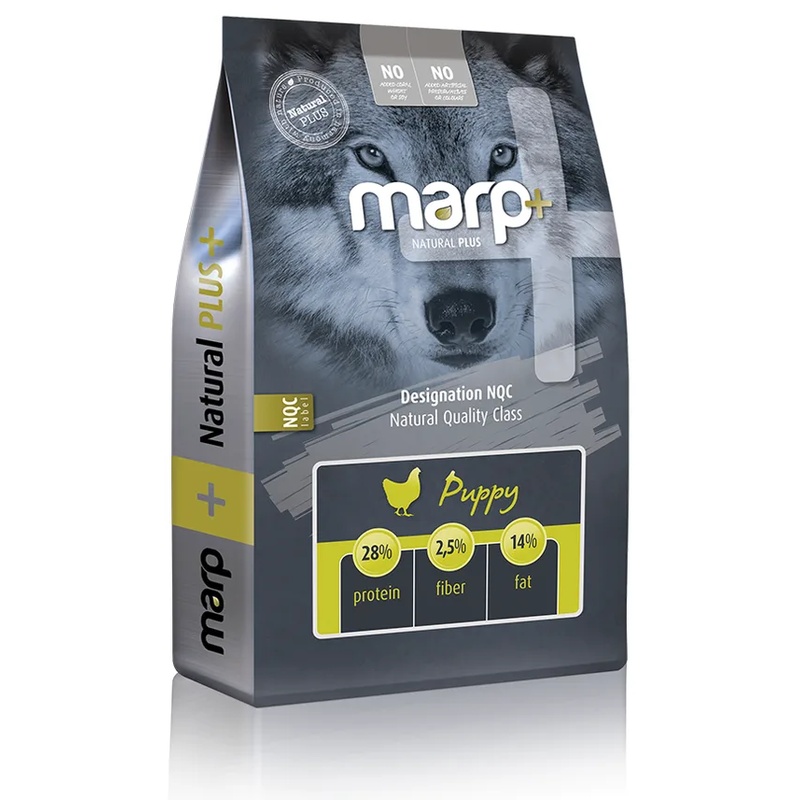 Monoproteinová receptura Marp Natural Plus Puppy je založená na kuřecí moučce a tuku a vyznačuje se jednoduchým složením z kvalitních surovin od lokálních dodavatelů. Granule mají ideální výživový profil pro štěňata všech plemen a ideální poměr vápníku a fosforu pro štěňata velkých plemen. Složení krmiva obohacené o lososový olej a lněné semínko působí blahodárně na kůži a srst. Sušená čekanka bohatá na fruktooligosacharidy podporuje zažívání a kloubní výživa mobilitu.