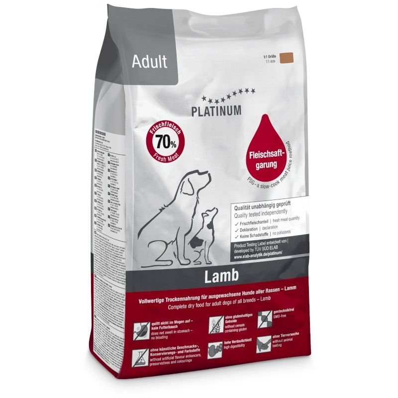 Polovlhké krmivo Platinum Adult Lamb založené na jehněčím mase chutná psům všech věkových kategorií. Navíc je lehce stravitelné a má nízký obsah tuku. Obsahuje vitamíny řady A, D, E, C, železo, zinek a další důležité minerály. Neobsahuje žádné škodlivé látky ani umělé přísady, nezatěžuje tudíž trávicí trakt. Je vhodné i pro psy s citlivým zažíváním nebo problematickou kůží a srstí. Lehké jehněčí maso v kombinaci s rýží je ideální pro starší psy nebo psy se sníženou pohybovou aktivitou (například po kastraci). Díky jedinečné přípravě metodou Fleischsaftgarung (vaření ve vlastní šťávě ve vakuu za nízkých teplot) si navíc granule zachovávají důležité živiny, bohatou chuť i vůni. Granule jsou balené do alu-foliových pytlů, které zachovají čerstvost a vůni do posledního sousta.