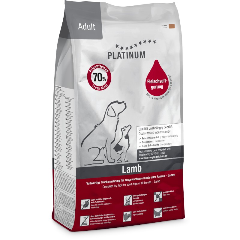 Polovlhké krmivo Platinum Adult Lamb založené na jehněčím mase chutná psům všech věkových kategorií. Navíc je lehce stravitelné a má nízký obsah tuku. Obsahuje vitamíny řady A, D, E, C, železo, zinek a další důležité minerály. Neobsahuje žádné škodlivé látky ani umělé přísady, nezatěžuje tudíž trávicí trakt. Je vhodné i pro psy s citlivým zažíváním nebo problematickou kůží a srstí. Lehké jehněčí maso v kombinaci s rýží je ideální pro starší psy nebo psy se sníženou pohybovou aktivitou (například po kastraci). Díky jedinečné přípravě metodou Fleischsaftgarung (vaření ve vlastní šťávě ve vakuu za nízkých teplot) si navíc granule zachovávají důležité živiny, bohatou chuť i vůni. Granule jsou balené do alu-foliových pytlů, které zachovají čerstvost a vůni do posledního sousta.