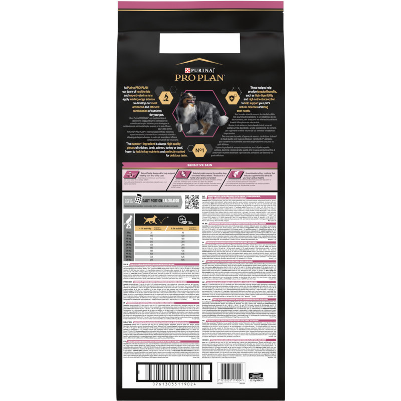 Krmivo Purina PRO PLAN® Sensitive Skin MEDIUM ADULT bylo vyvinuto pro dospělé psy středních plemen (s hmotností 10–25 kg). Granule obsahují vitamín D, minerální látky a specifické množství omega-3 mastných kyselin (0,7 %), které přispívají ke zdraví zubů a dásní. Krmivo má vysoký podíl lososa, a tak zajišťuje optimální výživu středních plemen od 12 měsíců až do 7 let. Následně byste měli přejít na produkty z řady Age Defence.