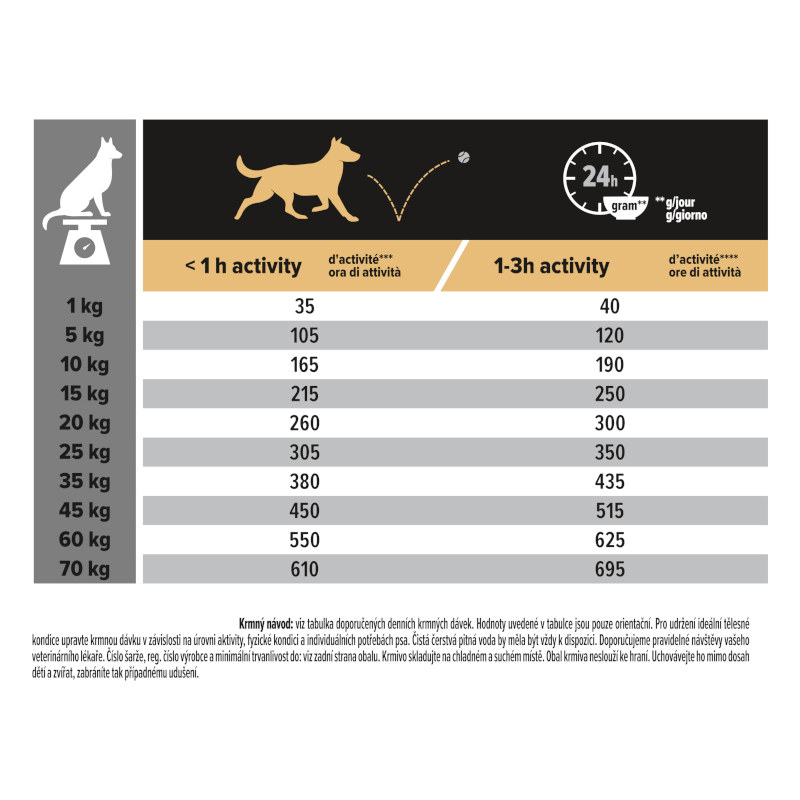 viz tabulka doporučených denních krmných dávek. Hodnoty uvedené v tabulce jsou pouze orientační. Pro udržení ideální tělesné kondice upravte krmnou dávku v závislosti na úrovni aktivity, fyzické kondici a individuálních potřebách psa. Čistá čerstvá pitná voda by měla být vždy k dispozici. Doporučujeme pravidelné návštěvy vašeho veterinárního lékaře.