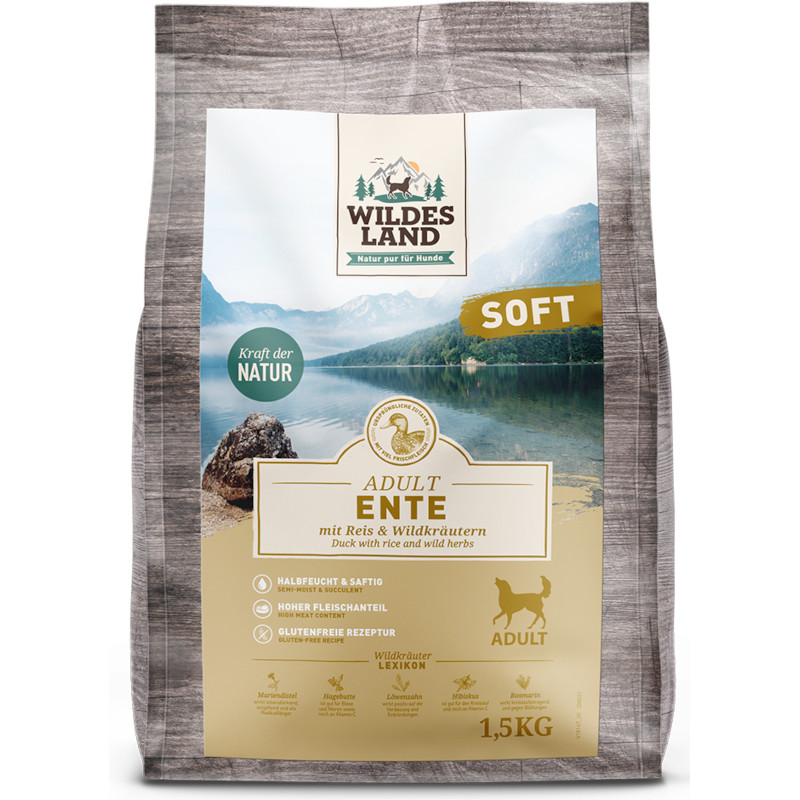 Polovlhké granule Wildes Land Softjsou vhodné pro dospělé psy všech plemen, kterým poskytují v souladu s nejnovějšími vědeckými poznatky všechny důležité živiny a vitamíny potřebné pro dlouhý a aktivní život. Mají vysoký obsah hypoalergenního kachního masa, které je zároveň jediným zdrojem živočišných bílkovin. Jako zdroje sacharidů slouží lehce stravitelná bezlepková rýže a brambory. Jde tudíž o ideální krmivo pro psy s citlivým zažíváním. Vysoký podíl čerstvého masa, zbytková vlhkost (18 %) a bylinky zvyšují chutnost krmiva.