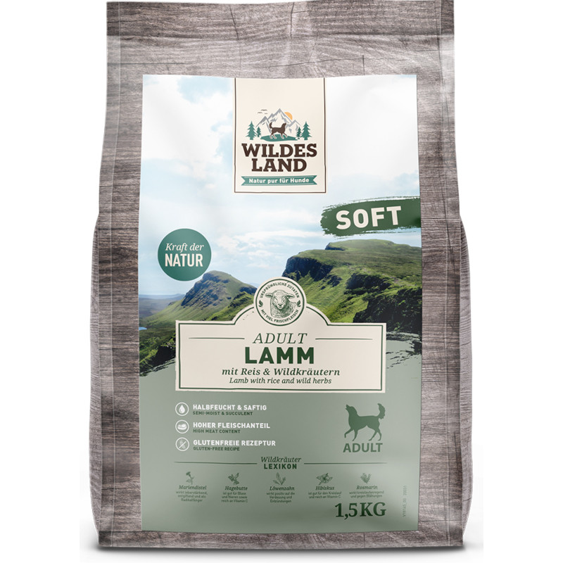 Polovlhké granule Wildes Land Soft jsou vhodné pro dospělé psy všech plemen, kterým poskytují v souladu s nejnovějšími vědeckými poznatky všechny důležité živiny a vitamíny, potřebné pro dlouhý a aktivní život. Mají vysoký obsah hypoalergenního jehněčího masa, které je zároveň jediným zdrojem živočišných bílkovin. Jako zdroje sacharidů slouží lehce stravitelná bezlepková rýže a brambory. Jde tudíž o ideální krmivo pro psy s citlivým zažíváním. Vysoký podíl čerstvého masa, zbytková vlhkost (18 %) a bylinky zvyšují chutnost krmiva.