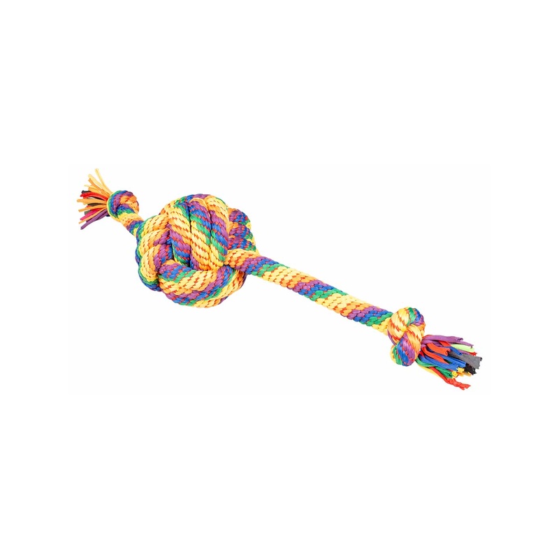 Odolné a barevné přetahovadlo pro psy se smotaným míčkem uprostřed je spletené z pružných pruhů látky připomínající legínovinu. Hračka je elastická, což zvyšuje zábavu při přetahování a aportování. Uzly ve hře poskytují lepší úchop a pevnost a kvalitní materiál zajišťuje dlouhou životnost hračky.
