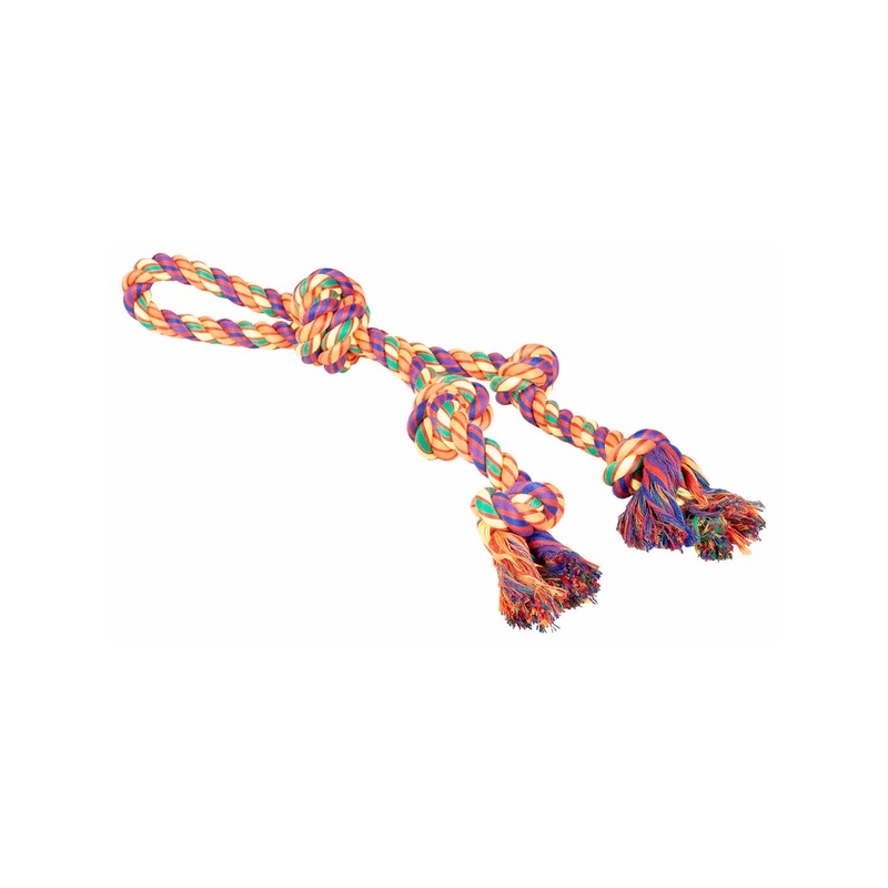 Odolné bavlněné přetahovadlo pro psy je spletené z pevných barevných provázků s uzly a na jedné straně je zakončené okem pro snadné uchopení. Hodí se pro přetahování, aportování i kousání. Bavlněné provázky během hry přirozeně čistí chrup a přispívají tak ke zdraví zubů a dásní.