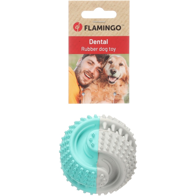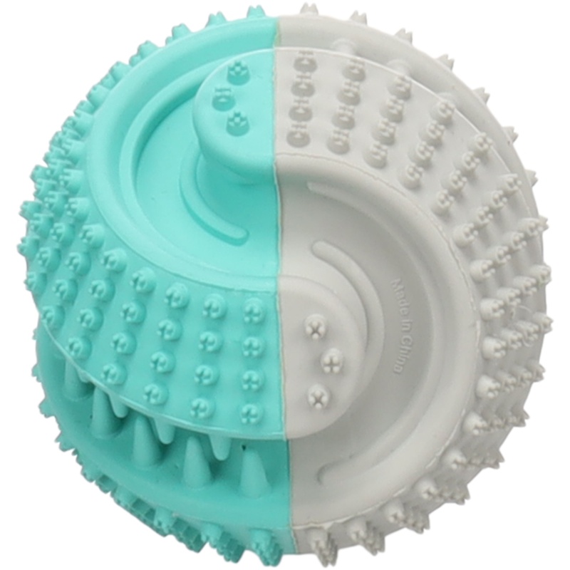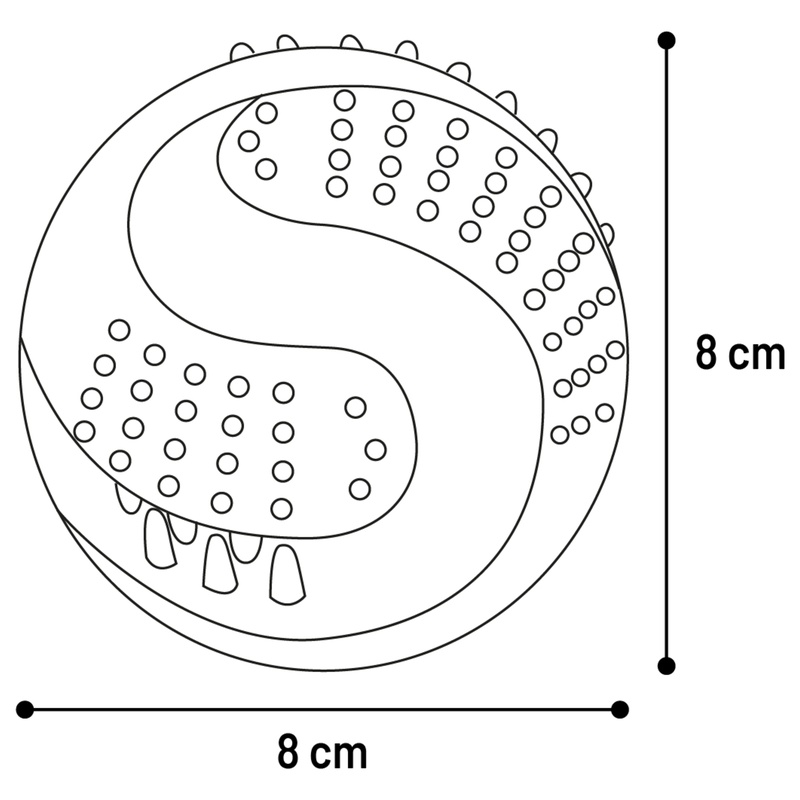 Gumová hračka pro psy ve tvaru míčku je vhodná ke kousání i aportování. Při kousání masíruje dásně a pomáhá omezovat tvorbu zubního plaku, čímž přispívá k přirozené péči o chrup. Prohlubně v hračce lze naplnit drobnými pamlsky nebo jedlou pastou a zvýšit tak motivaci ke hře.