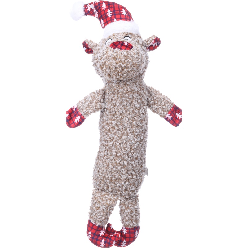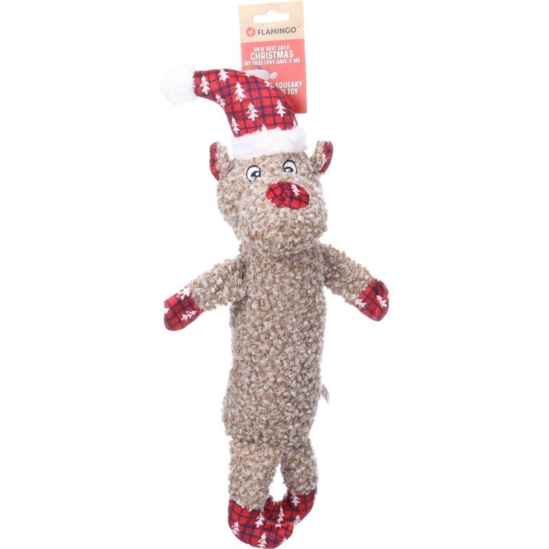 Vánoční hračka pro psy ve tvaru soba je vyrobena z měkkého plyše. Má dlouhé tělo a vánoční čepičku. Pro větší potěšení ze hry obsahuje sob pískátko.