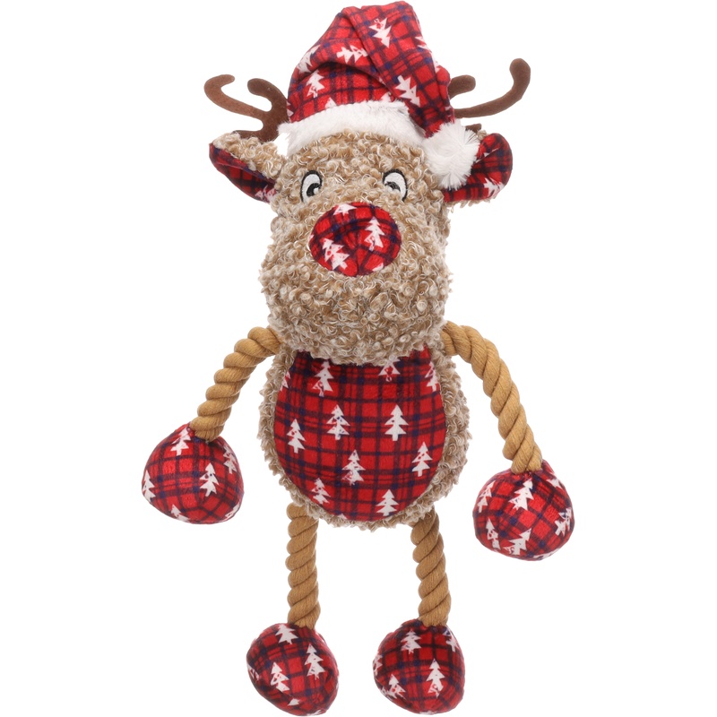 Hračka pro psy ve tvaru soba s vánoční čepičkou je vyrobena z měkkého plyše a má provázkové končetiny. Pro větší potěšení ze hry obsahuje sob pískátko.