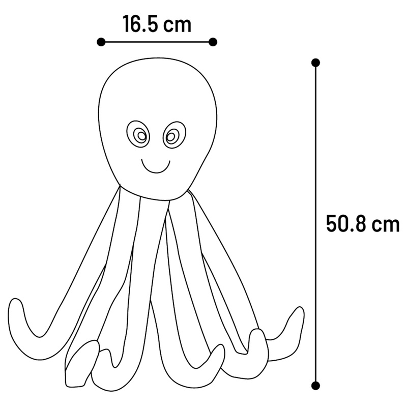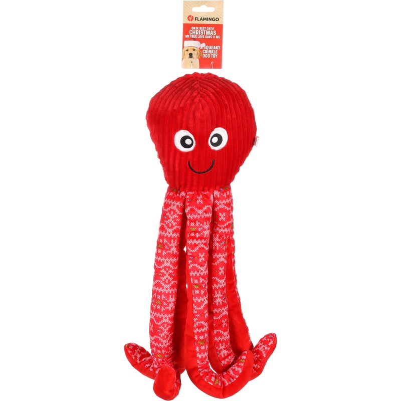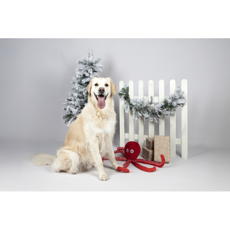 Vánoční hračka pro psy ve tvaru chobotnice je vyrobena z měkké tkaniny s manšestrovou úpravou. Pro větší zábavu hračka šustí a obsahuje pískátko.