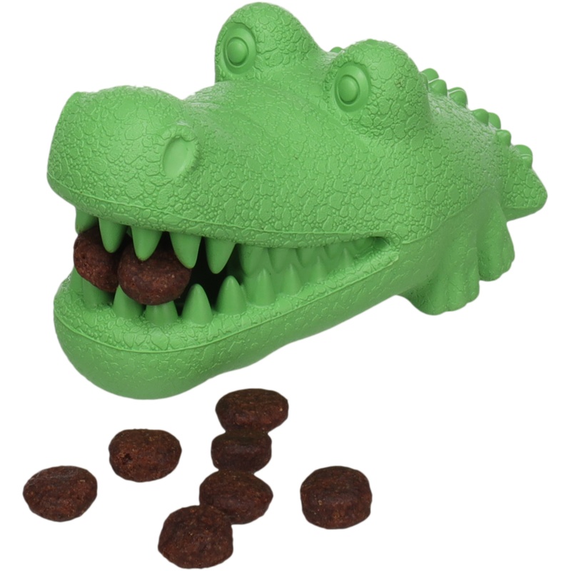 Gumová hračka pro psy ve tvaru krokodýla je vhodná pro kousání a plnění pamlsky nebo granulemi. Podporuje aktivní hru a zabaví psa na delší dobu.