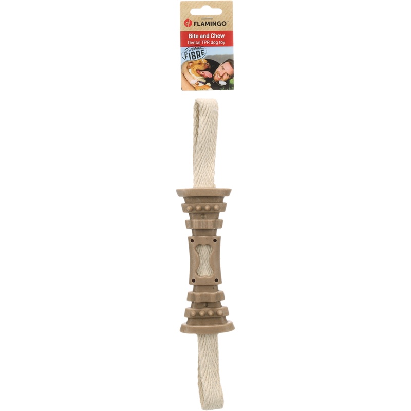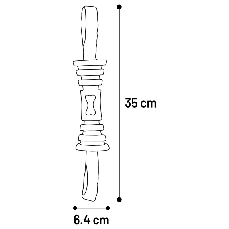 Hračka pro psy je vyrobená z termoplastické gumy (TPR) s bambusovým vláknem. Při kousání masíruje dásně a pomáhá omezovat tvorbu zubního plaku, čímž přispívá k přirozené péči o chrup. Úchyty na obou koncích hračky slouží k interaktivní hře a přetahování. Prohlubně v tyčce lze naplnit jedlou pastou a zvýšit tak motivaci ke hře.