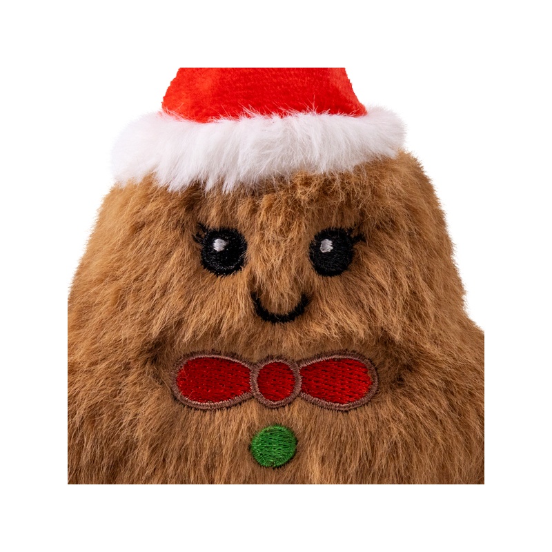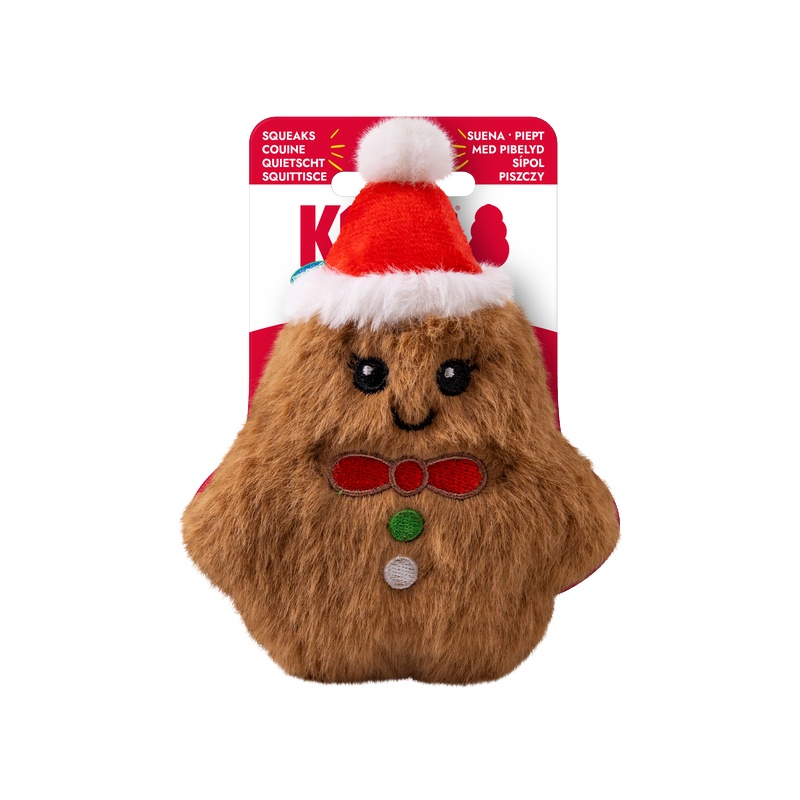 Heboučký plyšový perníček KONG Holiday Snuzzles Mini Gingerbread láká nejen k mazlení, ale i k divočejším hrátkám díky odolnému pískacímu polštářku, který vyplňuje celé jeho tělo. Jemný plyš a zploštělý tvar dělají z kousání a nošení této hračky v tlamě skutečný požitek.