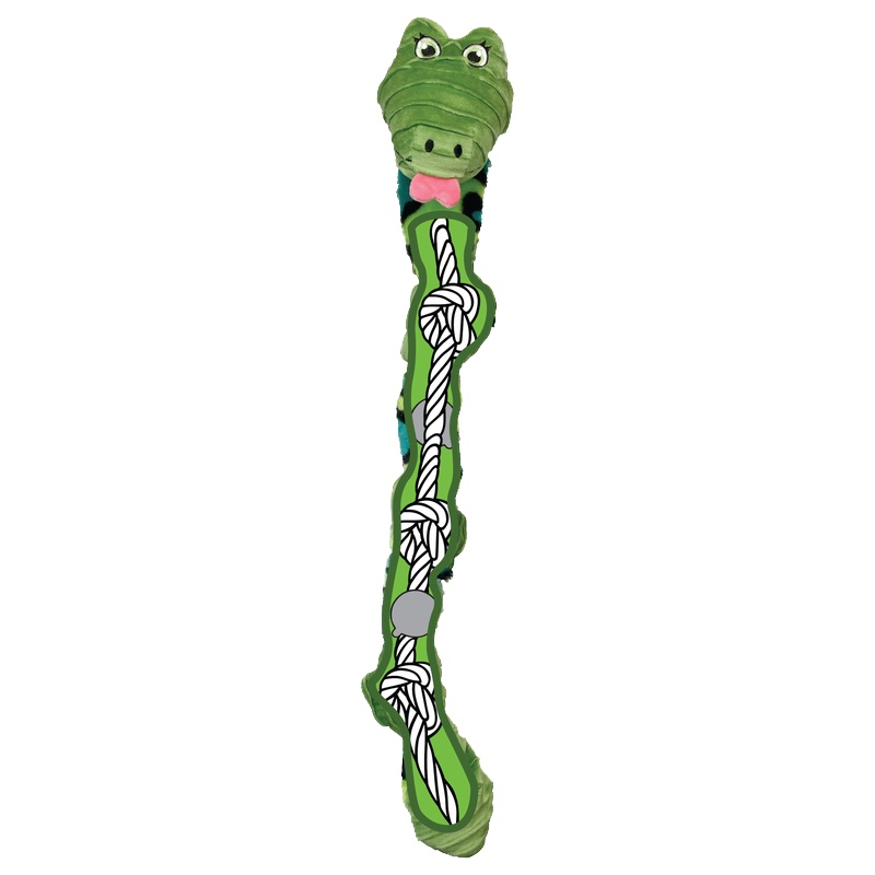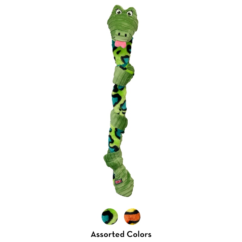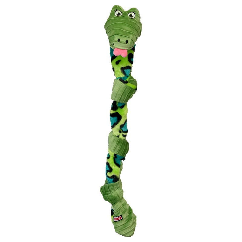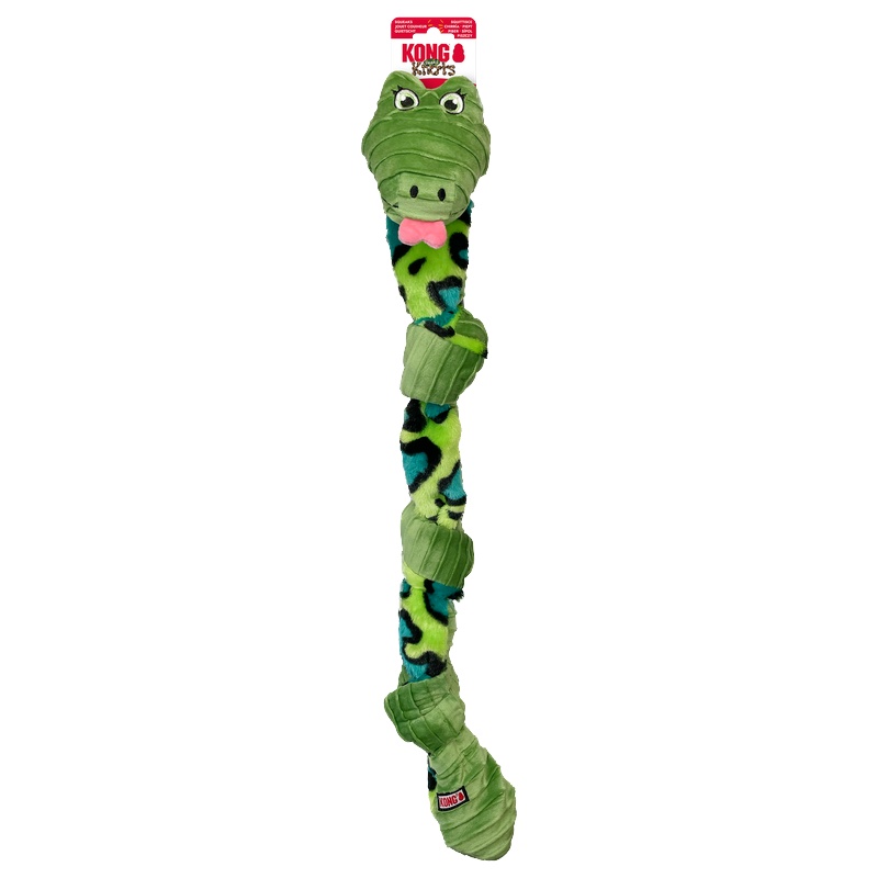 Hračka KONG Knots Snake je na povrchu měkká, ale uvnitř ukrývá pevnou provazovou kostru, která zvyšuje její odolnost a uspokojuje přirozený kousací instinkt psa. Díky dlouhému plandavému tělu je ideální pro lomcování, přetahování i aportování. Zabudovaná pískátka udržují pozornost psa a prodlužují hru. Had je dostatečně štíhlý, aby si s ním mohli hrát psi všech velikostí – perfektní parťák pro samostatnou i společnou zábavu.