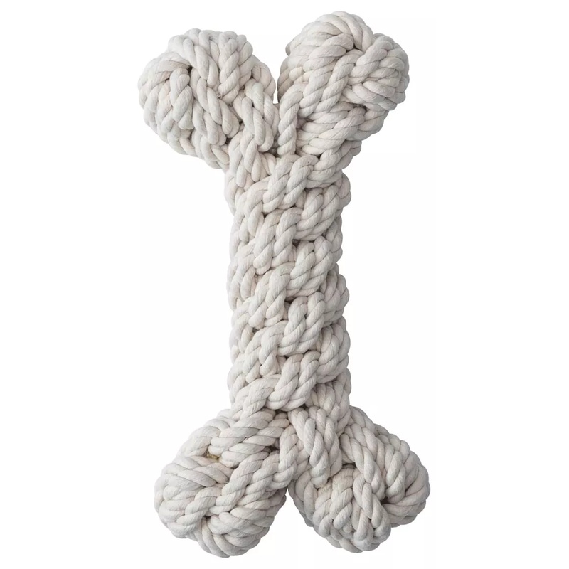 Bavlněné přetahovadlo pro psy ve tvaru kosti je spletené z pevných přírodních provázků. Hodí se pro přetahování, aportování i kousání. Bavlněné provázky během hry přirozeně čistí chrup a přispívají tak ke zdraví zubů a dásní.