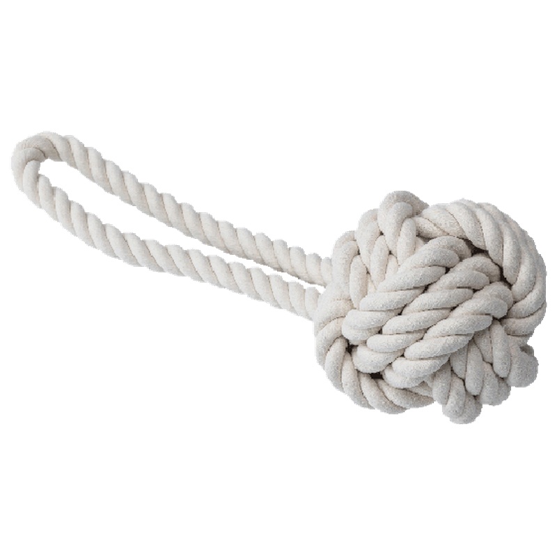 Bavlněné přetahovadlo pro psy spletené z pevných přírodních provázků do tvaru míče je zakončené okem pro lepší úchop při hře. Hodí se pro přetahování, aportování i kousání. Bavlněné provázky během hry přirozeně čistí chrup a přispívají tak ke zdraví zubů a dásní.