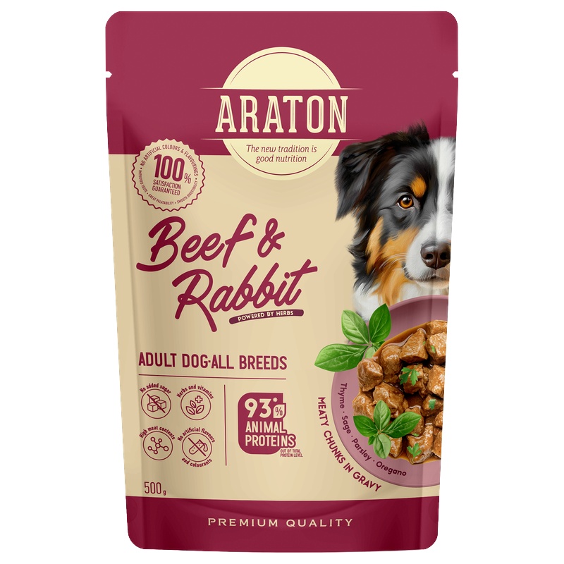 Kompletní vlhké krmivo Araton je určené pro dospělé psy všech plemen ke každodennímu krmení. Vzniklo bez nadbytečných přísad, ale s pečlivě vyváženým a prospěšným obsahem. Kousky v šťavnaté omáčce, 78 % složek živočišného původu a 93 % živočišného proteinu, doplněné o byliny.