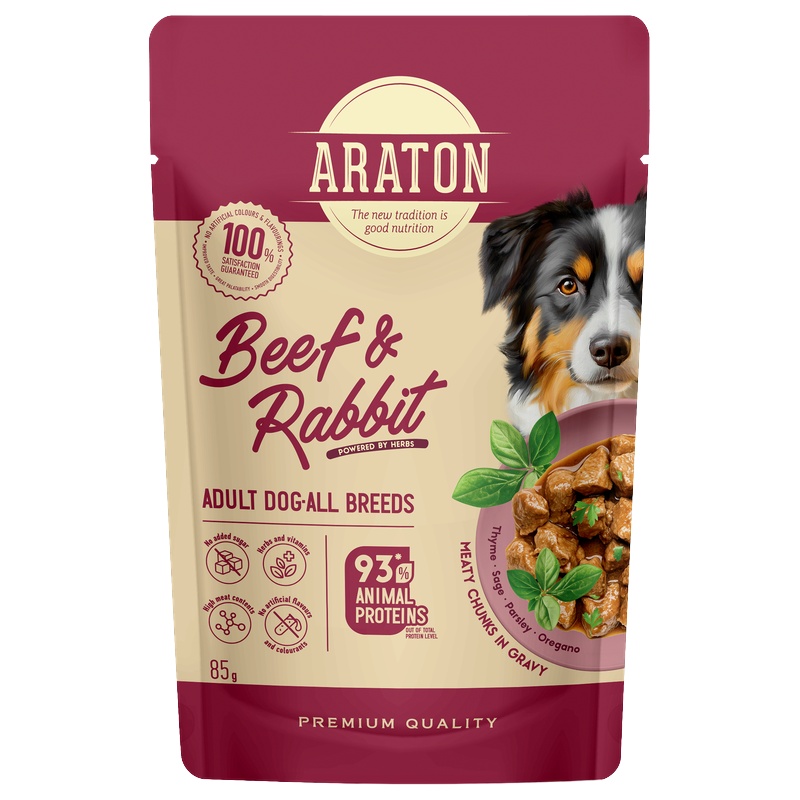 Kompletní vlhké krmivo Araton je určené ke každodennímu krmení dospělých psů všech plemen. Kousky s vysokým obsahem masa v šťavnaté omáčce jsou doplněné o byliny. Krmivo obsahuje 78 % složek živočišného původu a 93 % živočišného proteinu z celkového obsahu bílkovin.