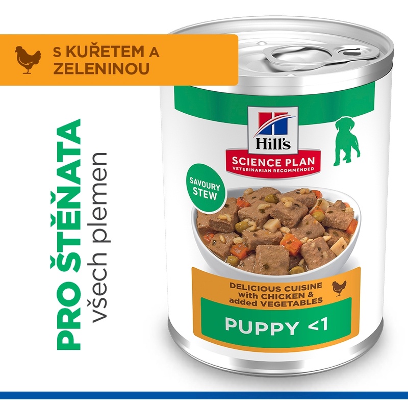 Hill's Science Plan Savory Stew je kompletní vlhké krmivo s kuřetem a zeleninou pro štěňata od odstavení do 1 roku věku a také pro březí a kojící feny. Konzerva obsahuje vysoce kvalitní bílkoviny pro tvorbu svalové hmoty a živiny, které podporují zdravý vývoj mozku a očí. Vyrobeno z lehce stravitelných ingrediencí pro celkovou pohodu rostoucího štěněte.