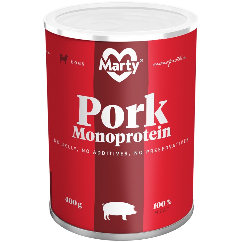 Konzerva MARTY Monoprotein Vepřové maso – mleté maso a další živočišné produkty pouze z jednoho druhu zvířete je ideálním krmivem pro psa. Strava pro psa z čistého masa, bez konzervantů a jiných přísad. Přítomnost čistě vepřového masa neutralizuje riziko alergické reakce na případné jiné druhy masa. Vhodné i pro alergické psy a monoproteinickou dietu, obsahuje pouze jeden druh masa.