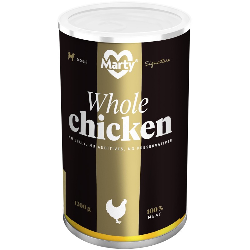 Krmivo pro psa - konzerva MARTY DeLuxe – celé kuře. Strava pro psa z čistě 100% masa bez konzervantů a dochucovacích či barvících přísad. Krmivo neobsahuje sóju, mouku, rýži ani jiné přísady.