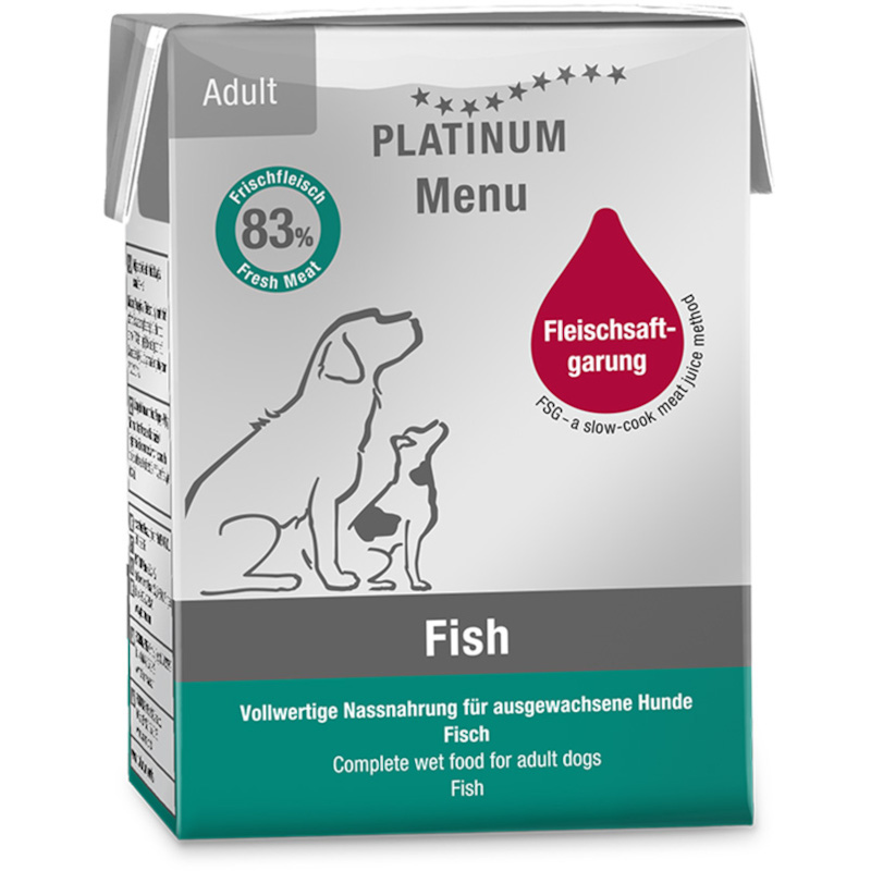 Paštika Platinum Menu Adult Fish obsahuje 83 % čerstvého rybího masa ze sardinek, tuňáka a pstruhů. Díky jedinečné metodě přípravy Fleischsaftgarung si maso uchová plnou chuť, vůni a všechny důležité živiny. Přísady se pomalu vaří za nízkých teplot uzavřené v obalu Tetra Recart. Všechna šťáva tak zůstane uvnitř, včetně vitamínů a minerálů. Receptura s vyváženým složením vyhovuje i psům s citlivým zažíváním.