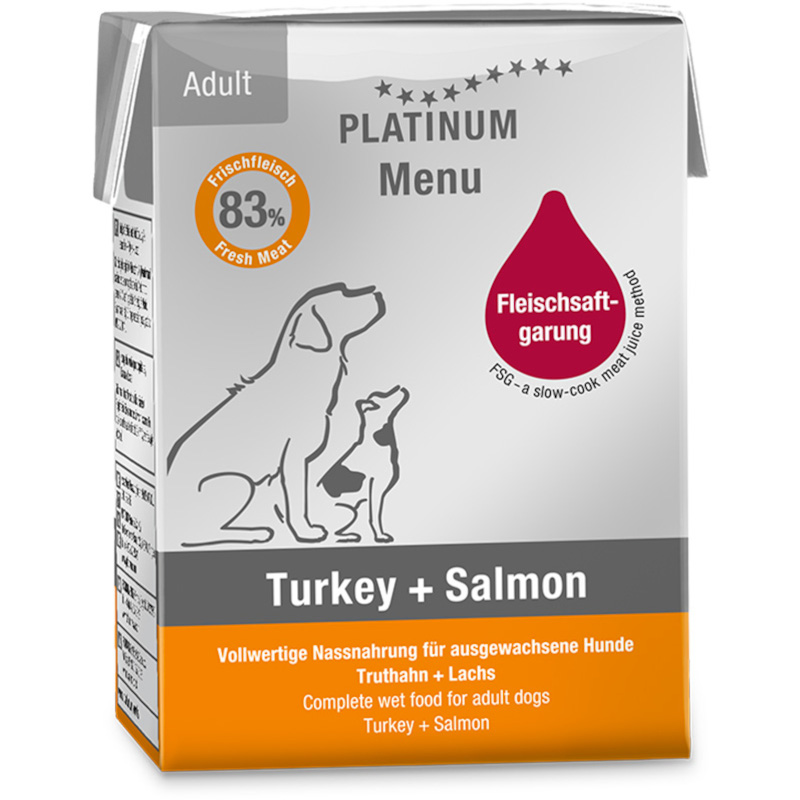 Paštika Platinum Menu Adult Turkey + Salmon obsahuje 83 % čerstvého masa z krůty a lososa. Díky jedinečné metodě přípravy Fleischsaftgarung si maso uchová plnou chuť, vůni a všechny důležité živiny. Přísady se pomalu vaří za nízkých teplot uzavřené v obalu Tetra Recart. Všechna šťáva tak zůstane uvnitř, včetně vitamínů a minerálů. Receptura s vyváženým složením vyhovuje i psům s citlivým zažíváním.