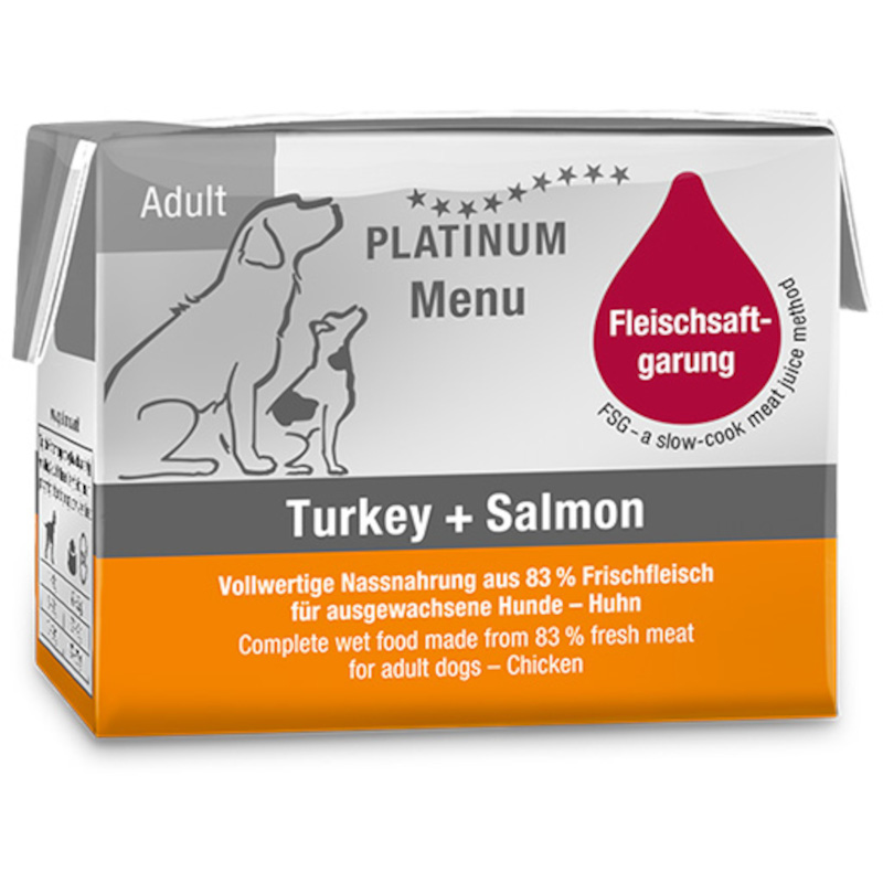 Paštika Platinum Menu Adult Turkey + Salmon obsahuje 83 % čerstvého masa z krůty a lososa. Díky jedinečné metodě přípravy Fleischsaftgarung si maso uchová plnou chuť, vůni a všechny důležité živiny. Přísady se pomalu vaří za nízkých teplot uzavřené v obalu Tetra Recart. Všechna šťáva tak zůstane uvnitř, včetně vitamínů a minerálů. Receptura s vyváženým složením vyhovuje i psům s citlivým zažíváním.