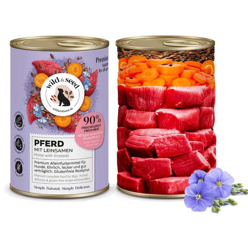 Prémiová konzerva Wild & Seed je pečlivě vytvořená pro psy všech kategorií včetně psů s alergiemi a citlivým trávením a na BARF stravě. Monoproteinová receptura dodává snadno stravitelné, vysoce kvalitní bílkoviny z koňského masa, které tělo vašeho psa snadno vstřebá a využije. Hypoalergenní bezobilné složení obohacené pouze o mrkev a lněná semínka poskytuje kompletní, lahodnou a vyváženou stravu.
