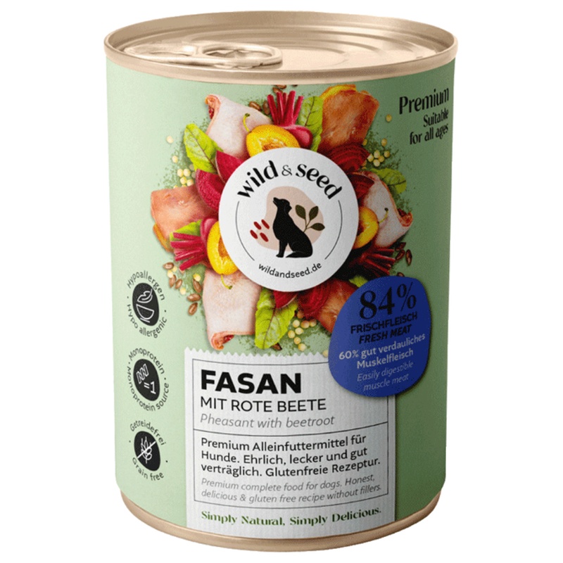 Prémiová konzerva Wild & Seed je pečlivě vytvořená pro psy všech kategorií včetně psů s alergiemi a citlivým trávením a na BARF stravě. Monoproteinová receptura dodává snadno stravitelné, vysoce kvalitní bílkoviny z bažantího masa, které tělo vašeho psa snadno vstřebá a využije. Hypoalergenní složení obohacené o červenou řepu, švestky, lněná semínka, pohanku a amarant poskytuje kompletní, lahodnou a vyváženou stravu.