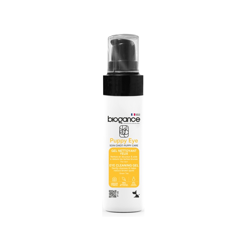 Gel Biogance Puppy Eye k jemnému čištění očního okolí štěňat s obsahem zeleného čaje a aloe vera pomáhá redukovat hnědé skvrny. S mandlovou vůní, neutrálním pH a bez obsahu parabenů.