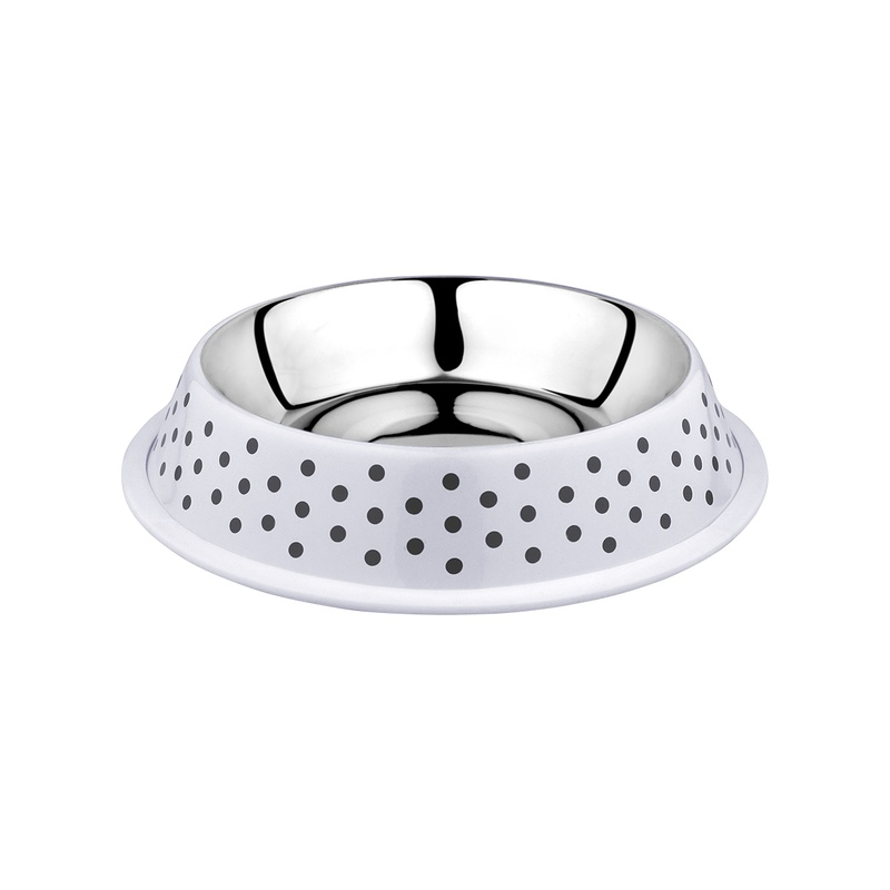 Miska Duvoplus Deco Fix na krmivo nebo vodu pro psy a kočky je vyrobena z broušené nerezové oceli. Spodní okraj má gumový lem, aby miska na podlaze neklouzala a nedělala hluk. Stylový vzhled jí dodává moderní potisk s puntíky. Vhodná pouze pro ruční mytí.
