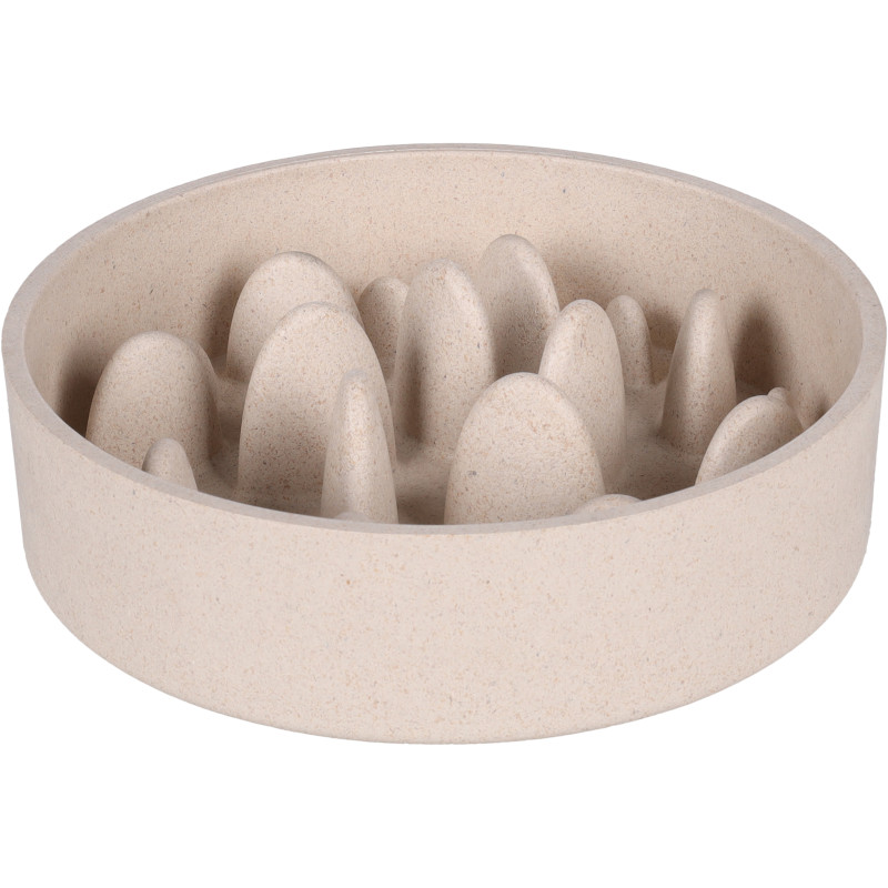 Zpomalovací misku lze naplnit granulemi, konzervou, kapsičkou nebo jejich kombinací. Výstupky v misce zajišťují pomalejší krmení. Pes musí vynaložit větší úsilí a obratnost, aby se dostal ke krmivu, a méně hltá. Miska ze směsi bambusu a plastu má protiskluzové dno. Myjte ji ručně.