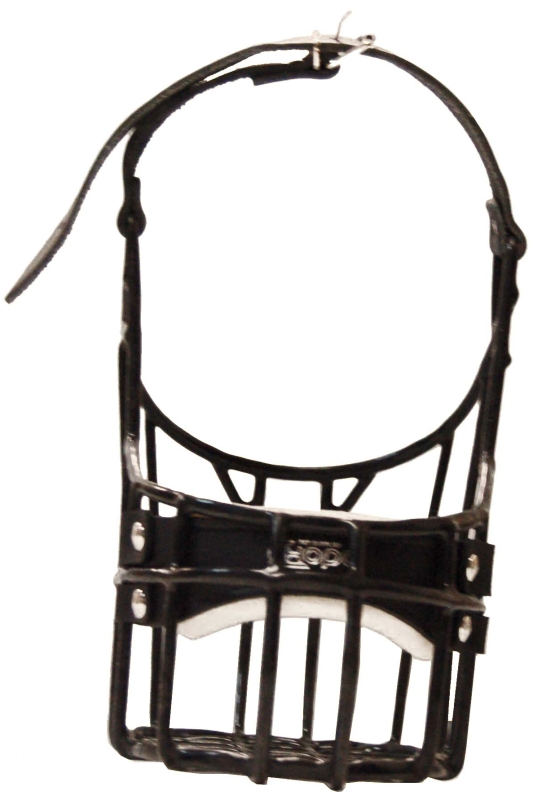 Kovový náhubek s koženými řemínky na zapínání.