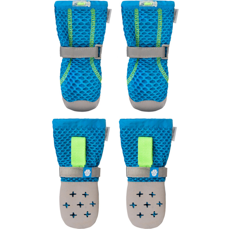Botičky Canada Pooch Hot Pavement Boots vám pomohou ochladit vašeho psa a ochránit jeho tlapky za letních veder. Po namočení síťovaného materiálu se voda začne odpařovat a boty díky tomu příjemně chladí. Nevyužívají přitom žádné chemické chladicí látky, pouze speciální savou, a přitom prodyšnou síťovinu, která dobře zadržuje vodu a umožňuje její postupné odpaření. Botičky můžete namočit před nasazením nebo polévat vodou přímo na psovi. Mají gumovou protiskluzovou podrážku s otvory pro odtok vody a zapínají se na stahovací gumičku a suchý zip.
