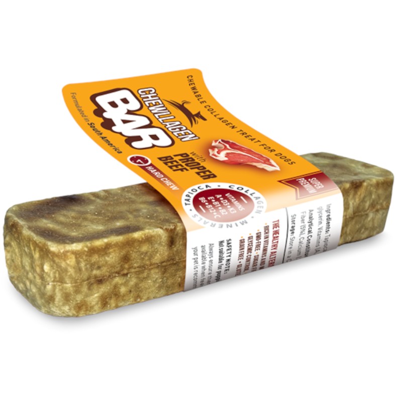 Odolná žvýkací tyčinka Chewllagen BAR Beef je speciálně navržená pro podporu zdraví kloubů, mobility a celkové pohody psů. Obsahuje vysoce kvalitní hydrolyzovaný kolagen, který hraje klíčovou roli při udržování zdraví pojivových tkání – tedy kloubů, kůže a šlach. Bezobilná (grain-free), bezlepková tyčinka je navíc obohacená o důležité vitamíny (A, C, E, D3, K3, B1, B2, B6 a B12) a minerály, neobsahuje žádný přidaný cukr ani GMO a má nízký obsah tuku, což z ní činí ideální pochoutku i pro psy se sklonem k nadváze.