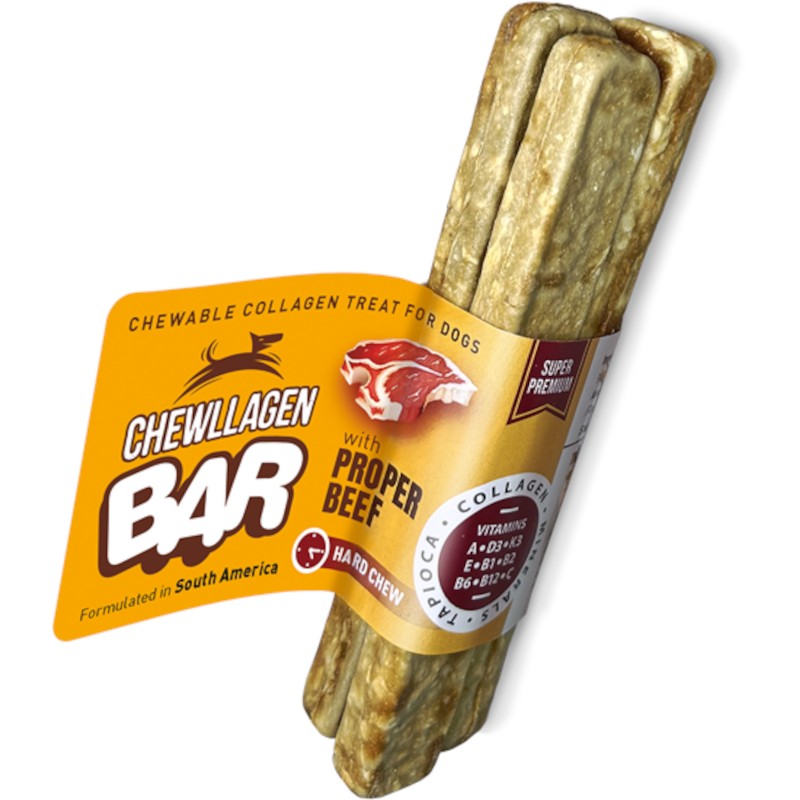 Odolná žvýkací tyčinka Chewllagen BAR Beef je speciálně navržená pro podporu zdraví kloubů, mobility a celkové pohody psů. Obsahuje vysoce kvalitní hydrolyzovaný kolagen, který hraje klíčovou roli při udržování zdraví pojivových tkání – tedy kloubů, kůže a šlach. Bezobilná (grain-free), bezlepková tyčinka je navíc obohacená o důležité vitamíny (A, C, E, D3, K3, B1, B2, B6 a B12) a minerály, neobsahuje žádný přidaný cukr ani GMO a má nízký obsah tuku, což z ní činí ideální pochoutku i pro psy se sklonem k nadváze.