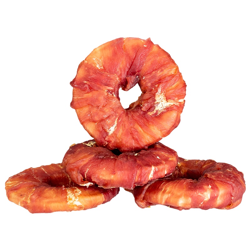Tuhé kroužky z buvolí kůže omotané kachním masem. Přírodní pochoutka, vhodná na posilování žvýkacích svalů a mechanickou očistu zubů. Vhodné pro středně velké a velké psy.