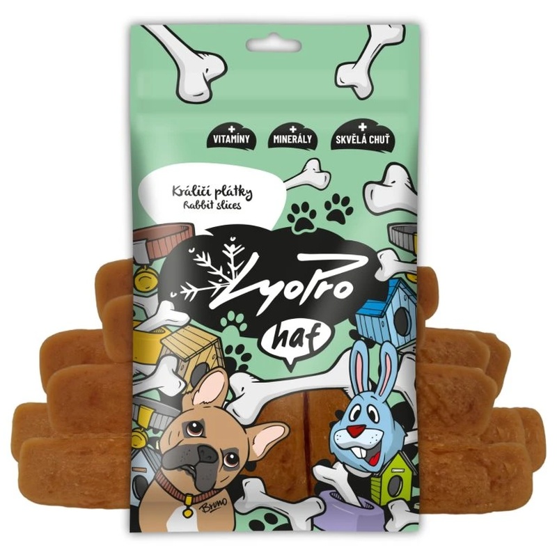 LyoPro haf Králičí plátky jsou vyrobené z kvalitního masa, které je šetrně sušené tak, aby si zachovalo svou přirozenou chuť i strukturu. Díky tomuto procesu sušení zůstávají zachovány cenné bílkoviny a minerály, aniž by bylo nutné používat chemické konzervanty či umělá dochucovadla. Sušené maso je přirozeně výživné a chutné, ideální jako zdravý pamlsek nebo odměna při výcviku. Díky tvrdší konzistenci navíc čistí zuby, podporuje zdraví čelisti a psa zabaví na delší dobu.