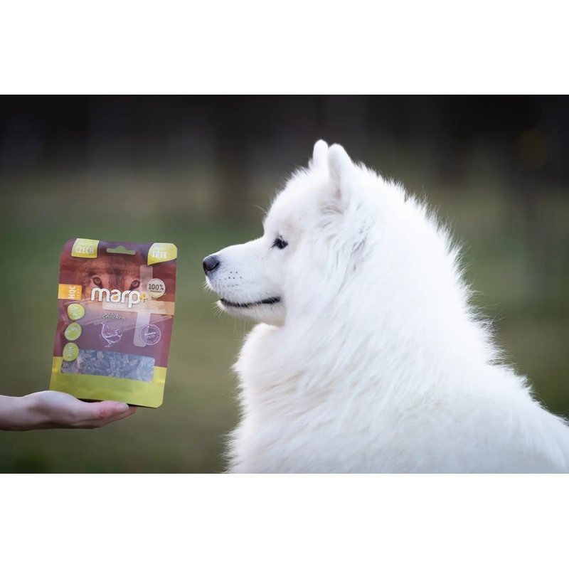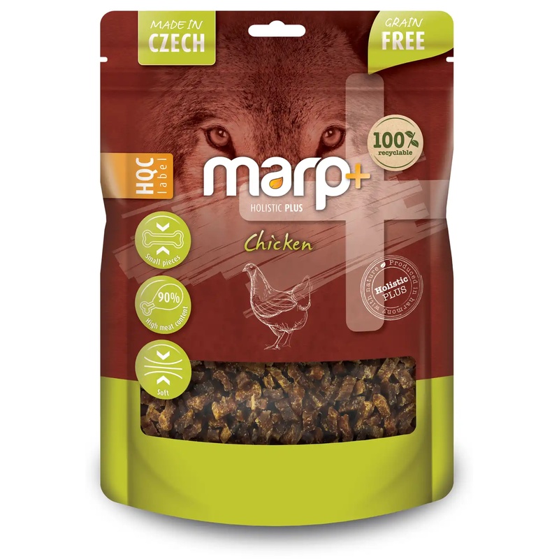 Lahodné bezobilné (grain-free) pamlsky Marp Holistic Plus s vysokým obsahem masa jsou vhodné pro štěňata i dospělé psy všech plemen. Měkké kuřecí kousky, ideální jako odměna při tréninku, neobsahují umělá barviva a konzervanty a jsou vyráběné šetrným procesem v ČR. Znovuuzavíratelný obal je 100% recyklovatelný.