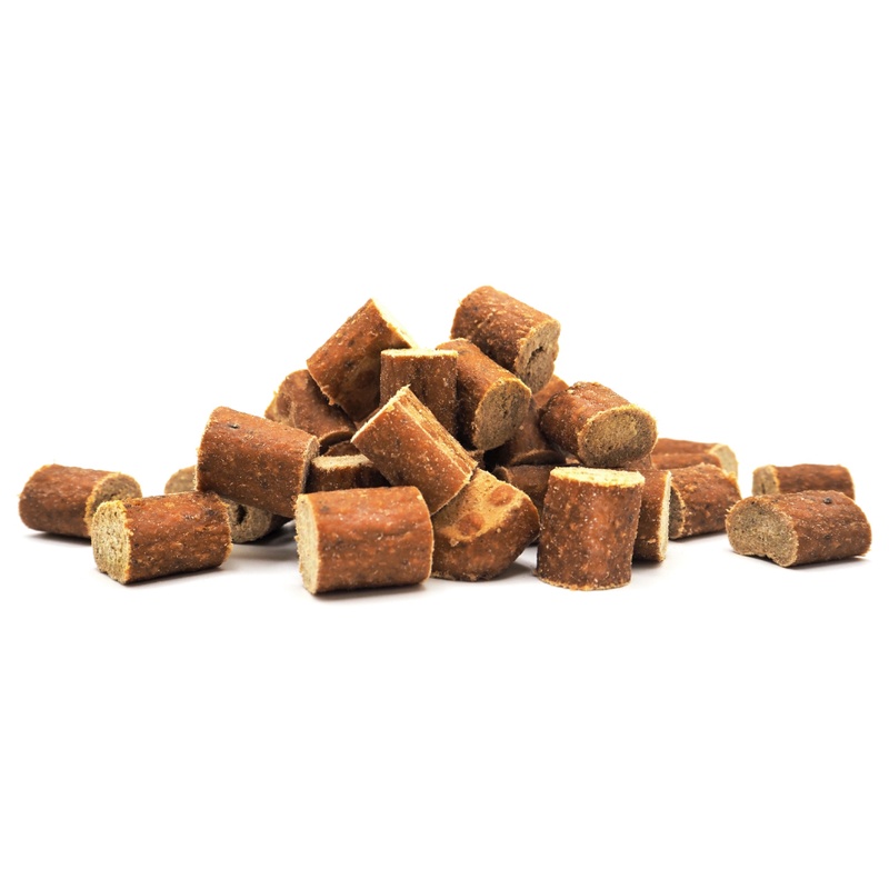 Lososové kousky jsou perfektní volbou pro každého, kdo chce svému psovi nabídnout zdravý, přírodní a měkký pamlsek. Losos je vynikajícím zdrojem bílkovin, obzvláště bohatým na omega-3 mastné kyseliny, které podporují lesk srsti, zdraví srdce a funkci kloubů. Kolostrum zvyšuje fyzickou odolnost a zkracuje dobu rekonvalescence. Spirulina podporuje vitalitu a výtažek ze slávky zelenoústé podporuje pohyblivost. Díky měkké struktuře se pamlsky snadno lámou a žvýkají, takže jsou vhodné pro psy všech velikostí a věkových kategorií včetně štěňat a psích seniorů.