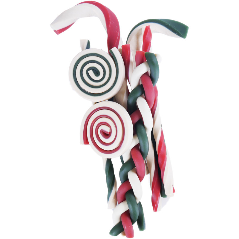 Osm žvýkacích pamlsků v dárkovém balení se stuhou. Žvýkačky vánočních barev a tvarů neobsahují žádnou useň, ale kuřecí maso a sladké brambory (batáty), a jsou díky tomu velmi dobře stravitelné. Ideální dárek pod vánoční stromeček.