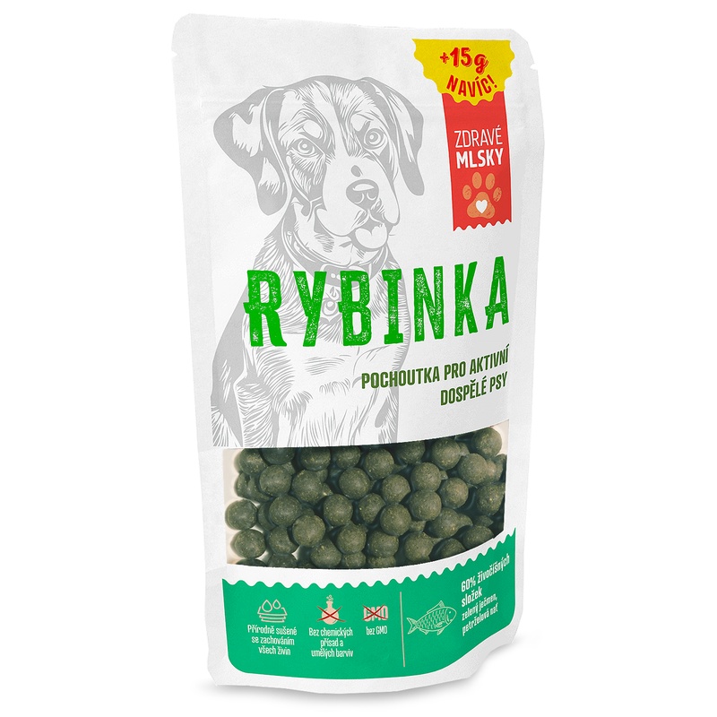 Zdravé mlsky Rybinka jsou ideální odměnou pro aktivní dospělé psy všech plemen. Základ pamlsků tvoří sušené maso, přídavek superpotravin (spirulina a zelený ječmen) podporuje celkovou kondici a lososový olej zdraví kůže a lesk srsti. Pamlsky vyrobené v České republice jsou přírodně sušené se zachováním všech živin, bez obsahu GMO, chemických přísad a barviv.