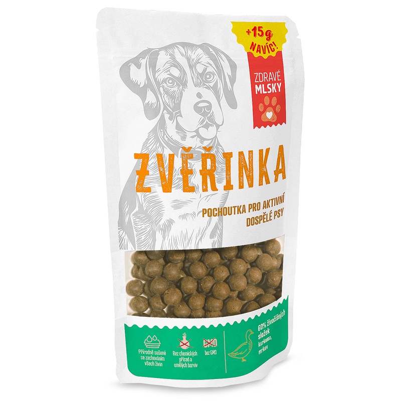 Zdravé mlsky Zvěřinka jsou ideální odměnou pro aktivní dospělé psy všech plemen. Základ pamlsků tvoří sušené maso, přidaná superpotravina kurkuma má silné protizánětlivé a antioxidační účinky a lososový olej podporuje zdraví kůže a lesk srsti. Pamlsky vyrobené v České republice jsou přírodně sušené se zachováním všech živin, bez obsahu GMO, chemických přísad a barviv.