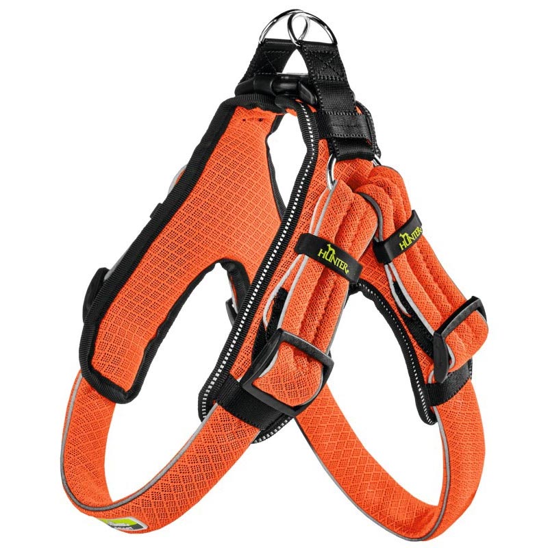 Moderní postroj HUNTER Manoa z jemné polyesterové síťoviny nabízí pejskům maximální míru pohodlí a bezpečí. Přestože působí mohutně, je velice lehký a měkký. O odolnost se stará vnitřní výztuž z nylonových vláken a dva ocelové kroužky mezi lopatkami, které rovnoměrně rozloží váhu psa v tahu a usnadní manipulaci s ním.