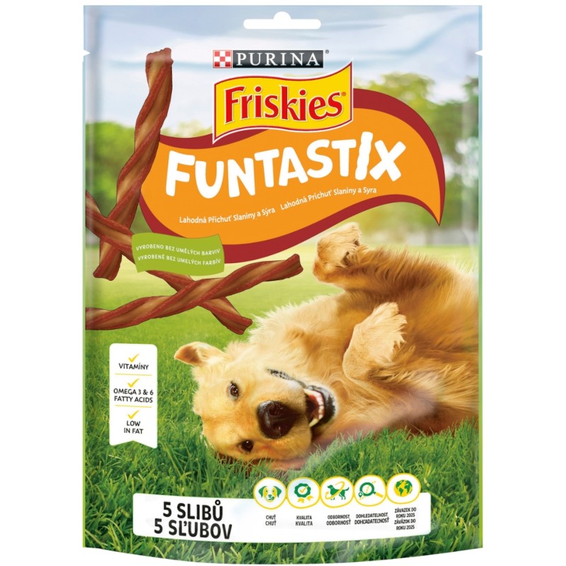 Lahodná kroucená pochoutka s příchutí slaniny a sýra je vyrobená z kvalitních ingrediencí bez přidaných umělých barviv. Tyčinky Friskies Funtastix mohou být podávány kdykoliv jako pochoutka nebo odměna, a to buď vcelku, nebo nalámané na kousky.