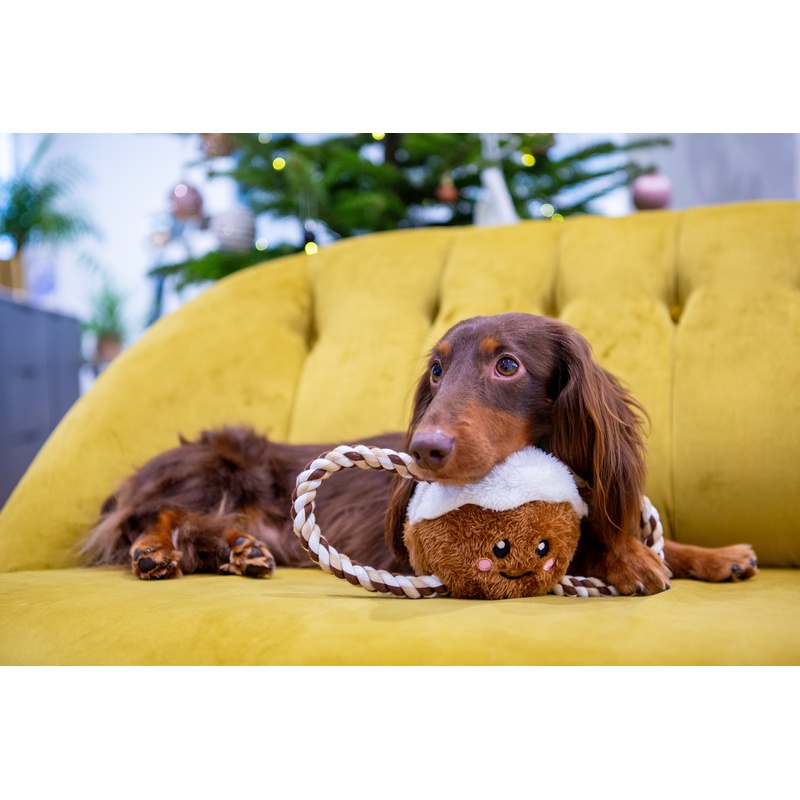 Roztomilá hračka pro psy – vánoční puding z hebkého plyše s provazovými úchyty – přímo vybízí k přetahování a nošení v tlamě.