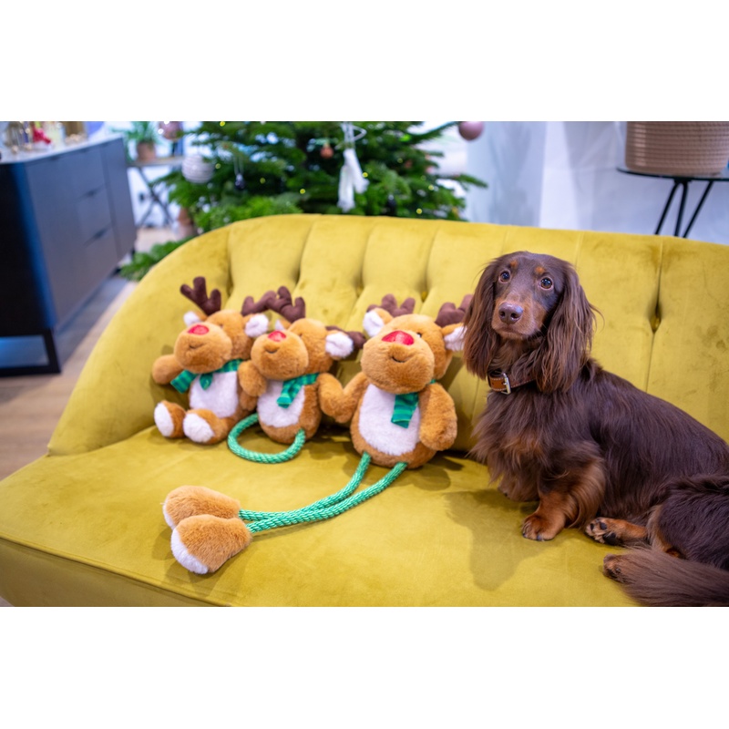 Roztomilá vánoční hračka pro psy – sob Ronny z hebkého plyše s dlouhýma provazovýma nohama – je ideální hračkou pro přetahování a lomcování i mazlení ve chvílích odpočinku. Pro větší vzrušení ze hry obsahuje pískátko.